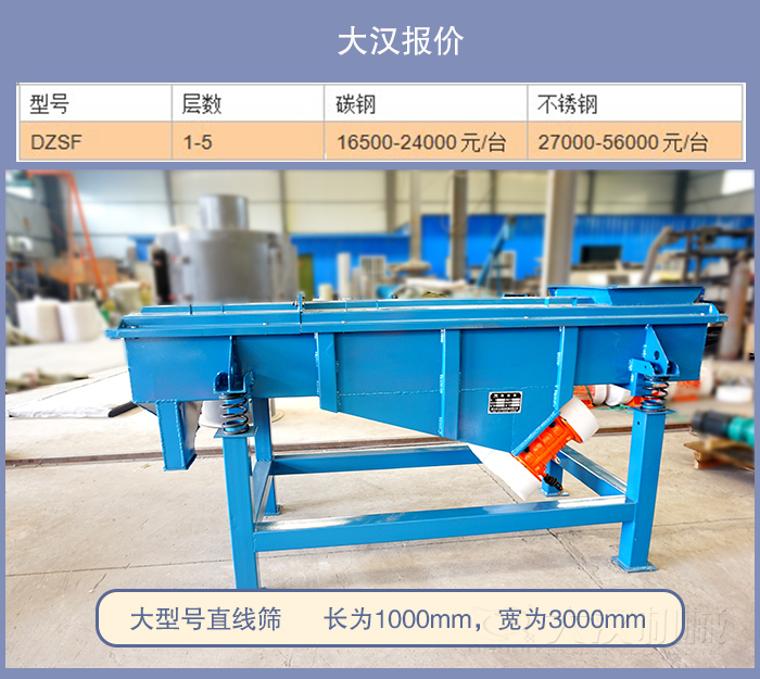 直線篩長為1000mm,寬為3000mm,屬于一種大型號(hào)直線篩,那么一臺(tái)直線篩價(jià)格多少呢?新鄉(xiāng)大漢在線為您報(bào)價(jià)。