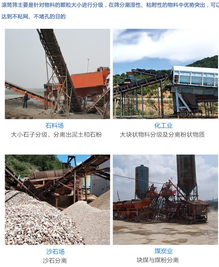 滾筒篩由一個穿孔的圓柱形滾筒組成,該滾筒通常在進料端以一定角度升高,當(dāng)進料沿旋轉(zhuǎn)滾筒螺旋向下時實現(xiàn)物理尺寸分離,其中小于篩孔的尺寸過小的材料通過篩網(wǎng),而尺寸過大的材料從滾筒的另一端排出,用于粘性和纖維材料的分類,例如在煤炭或天然石材工業(yè)中。