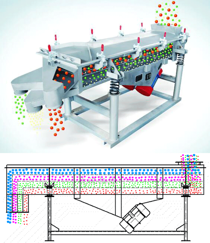 多層直線振動(dòng)篩利用雙臺電機(jī)作為振動(dòng)源,物料在篩網(wǎng)上受激振力的作用被拋起,同時(shí)向前做直線運(yùn)動(dòng),物料從給料機(jī)均勻地進(jìn)入直線篩進(jìn)料口后,通過多層篩網(wǎng)產(chǎn)生了數(shù)種不同規(guī)格的篩上物、篩下午,后分別又從各自的出口排出。